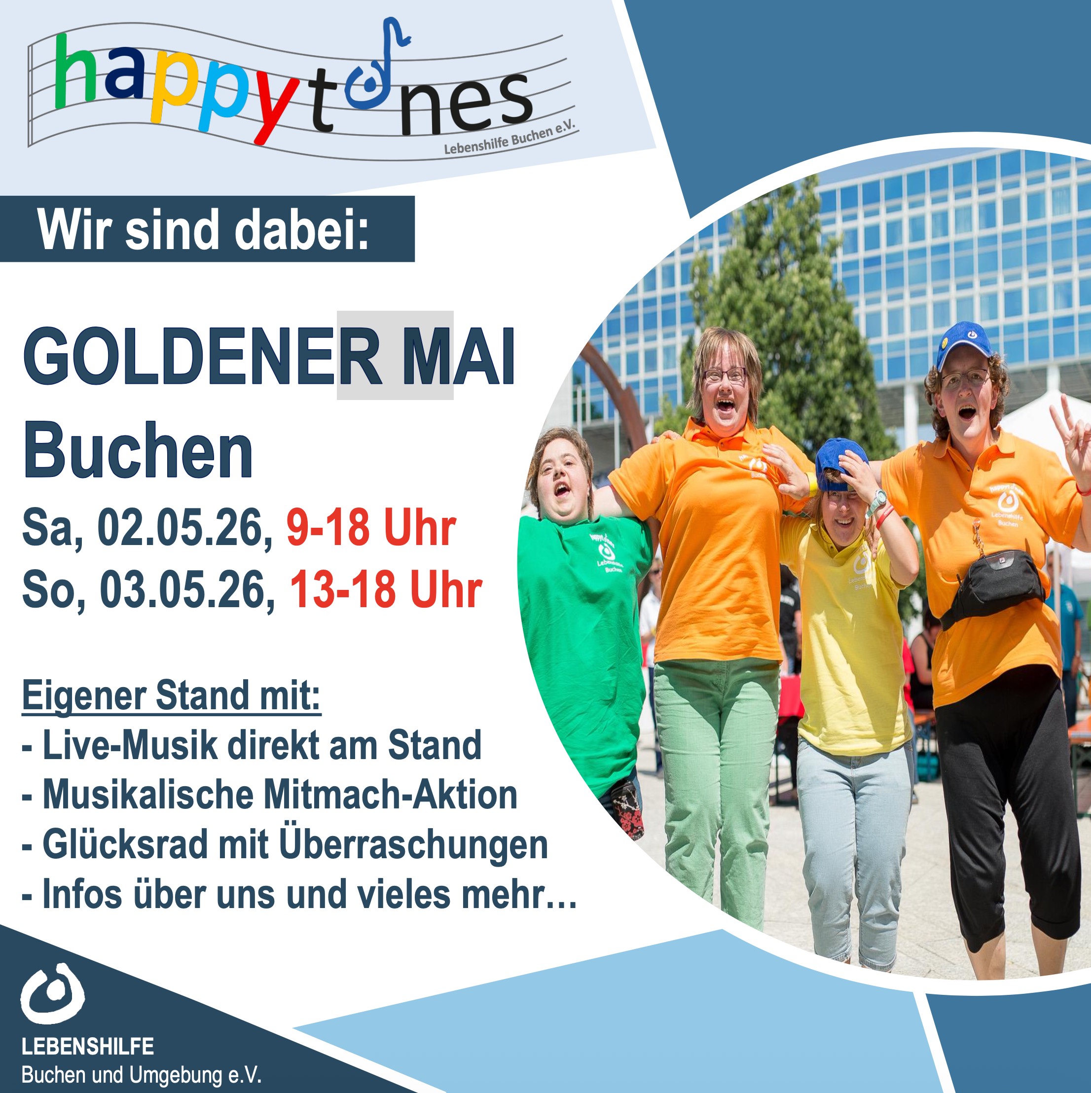 sind unsere Musikerinnen und Musiker unserer Band, der "Happytones" am Goldenen Mai in Buchen mit einem Stand aktiv. Wir freuen uns auf Sie. Mit einem Glücksrad, dazu gibt es Infos über uns, und musikalische Mitmachen Aktionen und besonders und Live Musik am Stand erfreuen wir alle Gäste, die bei uns vorbeischauen.