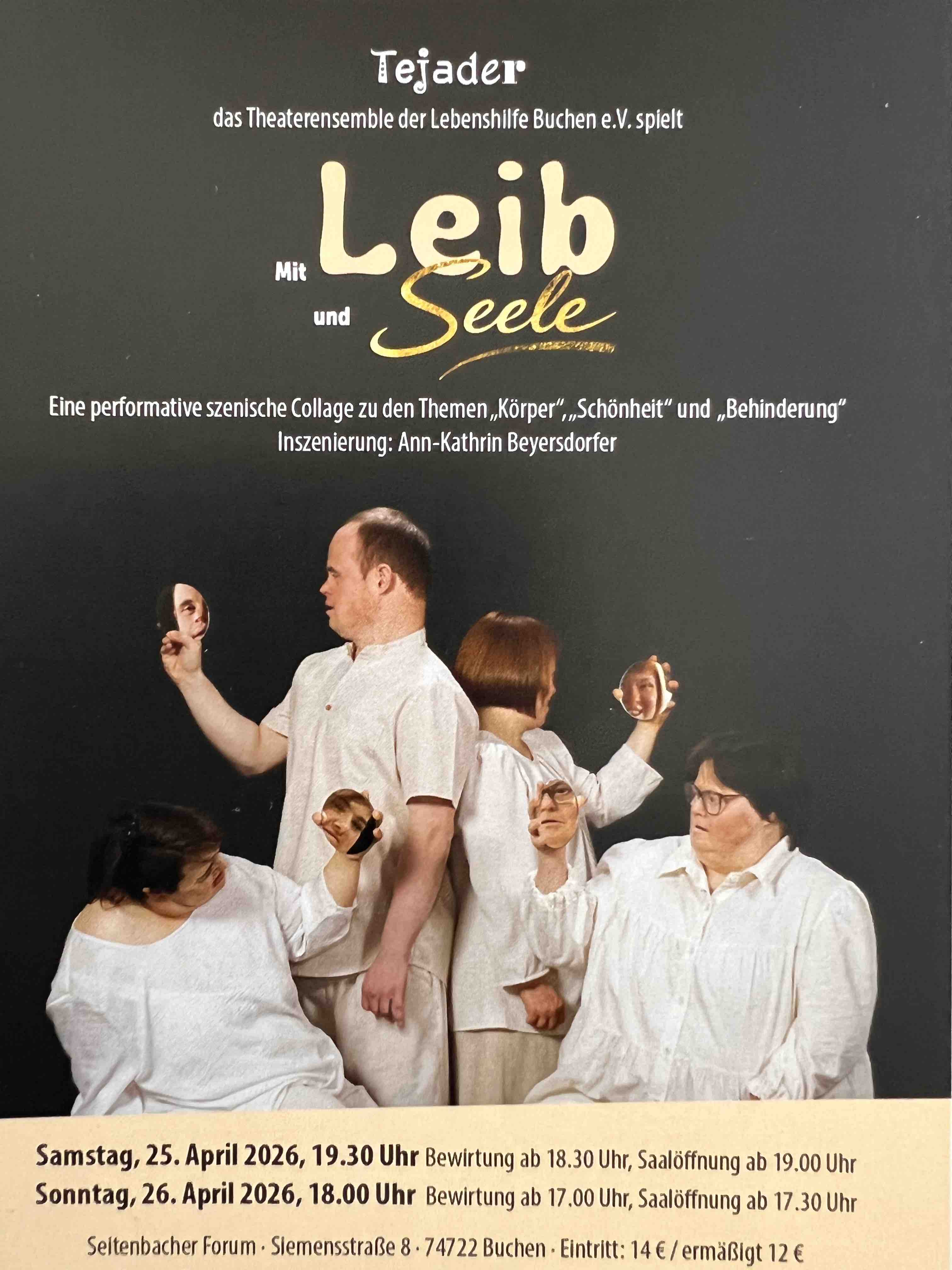 Nach dem großen Erfolg von "Schlaflos in Schlummerland" kehrt das Theaterensemble "tejader" der Lebenshilfe Buchen e.V. mit einem mutigen und zutiefst persönlichen Projekt zurück auf die Bühne. In einer performativen szenischen Collage setzen sich acht Schauspieler:innen mit Beeinträchtigung mit den großen Themen unserer Zeit auseinander: Körperideale, Selbstoptimierung und die Suche nach dem eigenen Selbstwert. Unter der Leitung von Theaterpädagogin Ann-Kathrin Beyersdorfer ist ein Stück entstanden , das unter die Haut geht. Die Darsteller:innen thematisieren ihre eigenen Erfahrungen mit dem Down.Syndrom, lassen uns an ihren Schmerzpunkten teilhaben und feiern gleichzeitig die Selbstliebe. Von Fitness-Wahn und Beauty-Produkten bis hin zum puren Genuss beim Essen - "Mit Leib und Seele" hält uns allen den Spiegel vor.